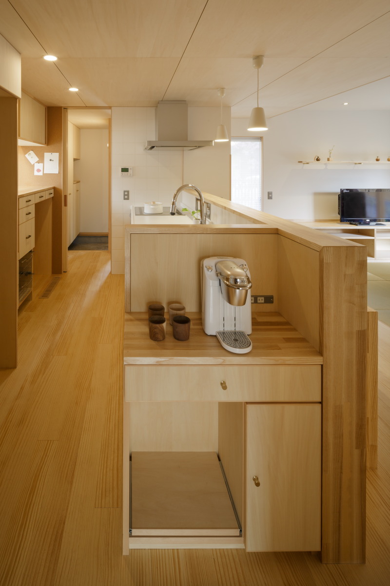 カウンターに置く調理器具、電子レンジ、ふきん、カトラリー、ゴミ箱など、キッチン廻りに必要ないろんなサイズを新たに買うもの、現在お持ちのものなどをお聞きし、お施主様と相談しながら、一つ一つスケッチでデザインしながら決めてきました。サイド部分にはコルク壁を設けてちょっとしたメモなどが張れる様にしたりしています。また間接照明やロールカーテンを吊戸下部分に埋め込むなどすっきりと見せるデザインにして、北庭の植栽を楽しんでいただけるようなご提案もしています。