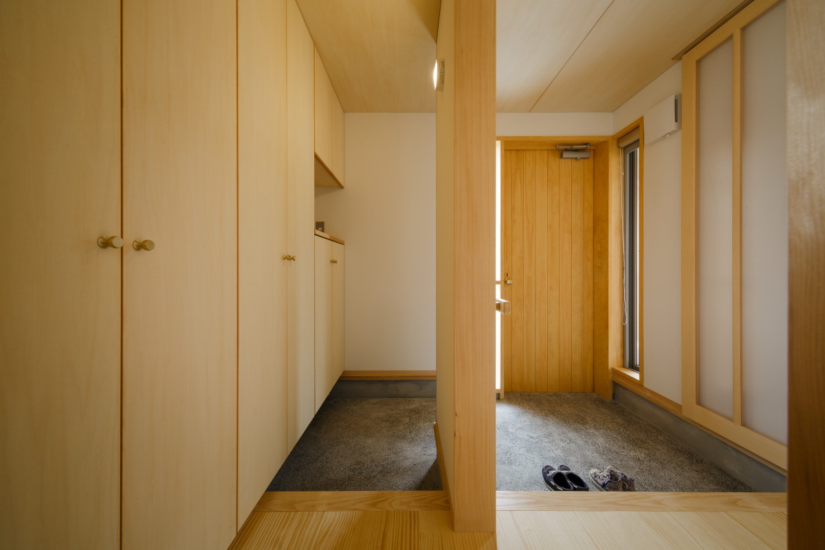 玄関収納はすっきりとした空間になるようにフラット感を出しつつ、靴やコート類だけでなく、雨に濡れずに受け取れるポストや傘掛を目立たぬように仕込み、一輪挿しなどを置けるようにカウンターを設けています。
