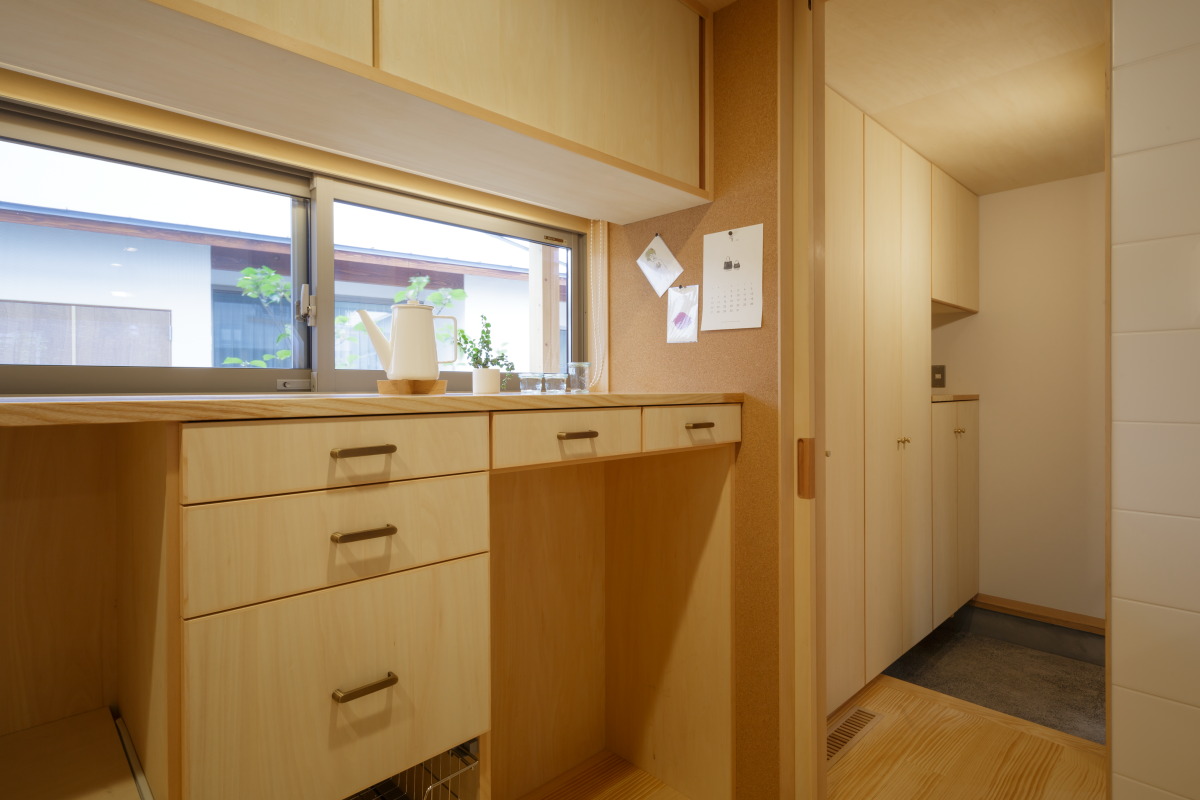 またキッチン横にはサイド収納を設けて、施主様の大好きな焼酎一升瓶を入れるスペースやお米の出し入れ、炊飯器やポット置き場など使い勝手を考慮したご提案としています。