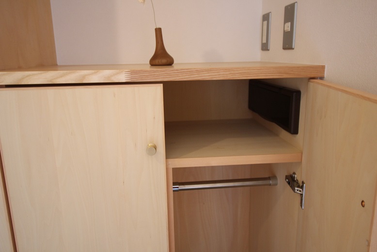 写真(上2枚)分かりにくいですが冷蔵庫を入れるスペースもきちんと治まるように囲いを設け、余った上部の空間にはホットプレートなどが納まるよう扉をつけています。