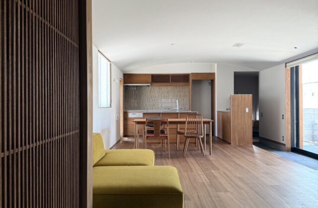 ひかりを導くくらし 12区画の分譲地に佇む平屋。 外と内をつなぐ土間空間と陽の光を柔らかく拡散させるR天井が特徴的で...